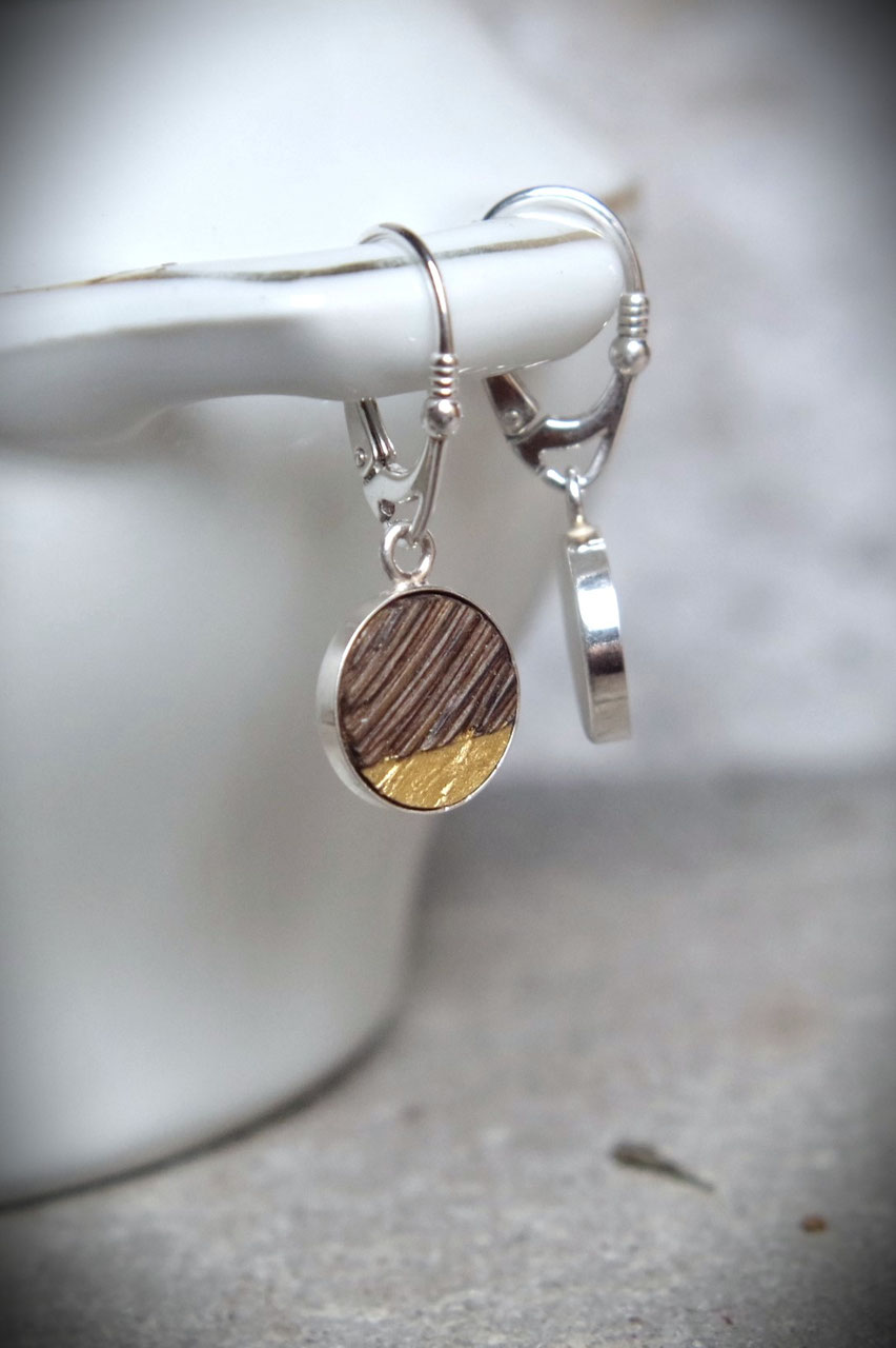 Handgefertigte Ohrhänger aus 200 Jahre alter Eiche, veredelt mit 24 Karat Blattgold und gefasst in 925 Silber. Jedes Paar ist ein einzigartiges Schmuckunikat mit Geschichte.